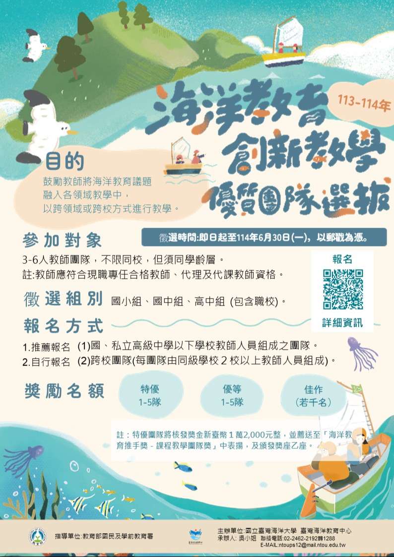 為培育具備海洋素養的人才,並推動海洋相關政策,教育部自108年起辦理旨揭選拔活動,鼓勵高級中學以下學校教師將海洋相關議題融入課程中,透過多元化教學方式在課堂上呈現,協助學生建立海洋知識,增進對海洋議題的理解與關注,進而提升其海洋素養,為我國未來永續發展奠定基礎。