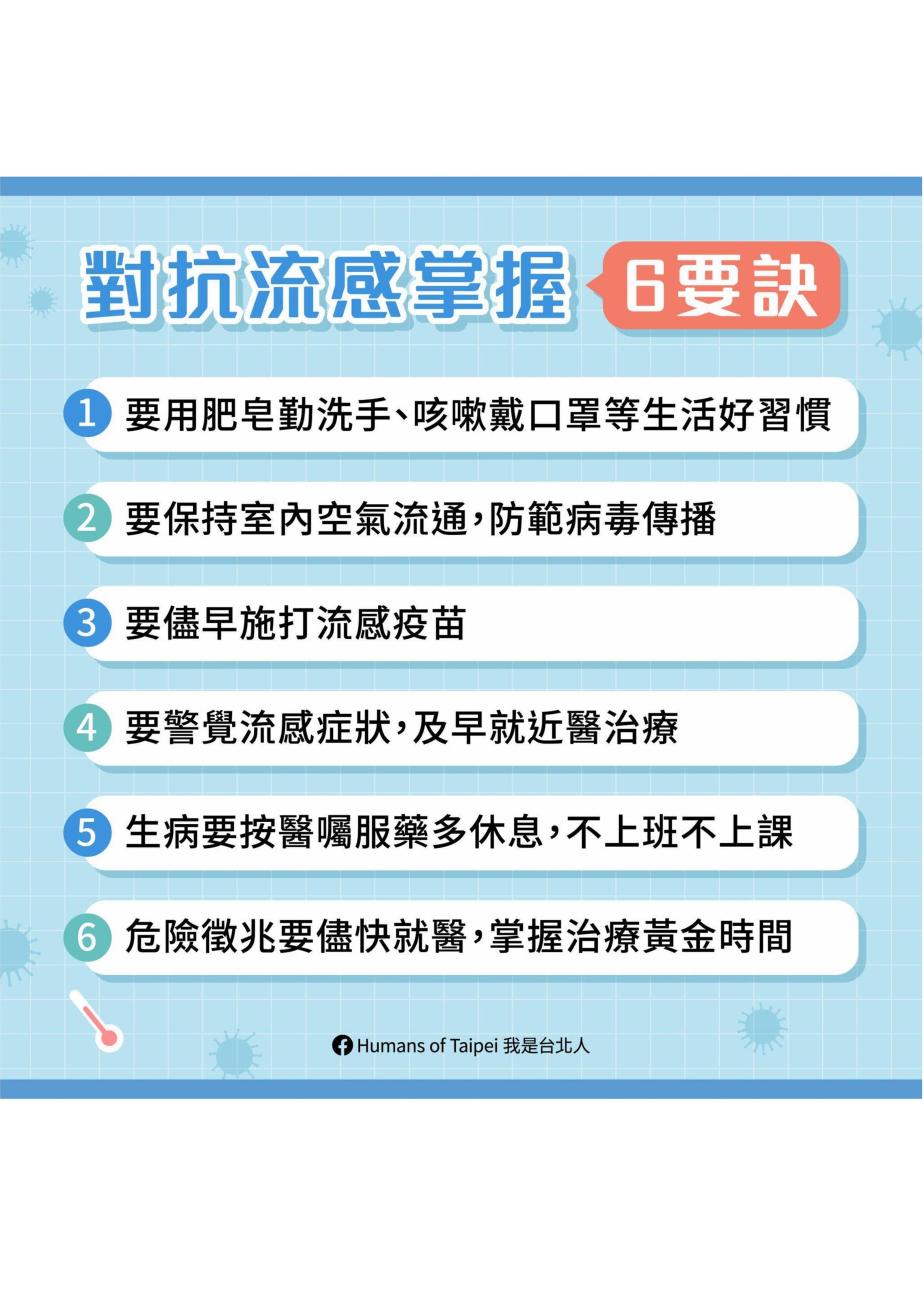 (一)提高警覺,如出現疑似流感症狀應務必佩戴口罩,加強手部衛生、勤洗手,並注意呼吸道衛生及咳嗽禮節。