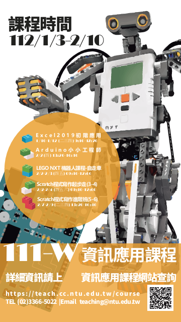 一、臺大計算機及資訊網路中心於112年1月3日起辦理寒假和1112資訊應用課程,課程詳細資訊與報名網址請至該中心網站查詢https://teach.cc.ntu.edu.tw/course。