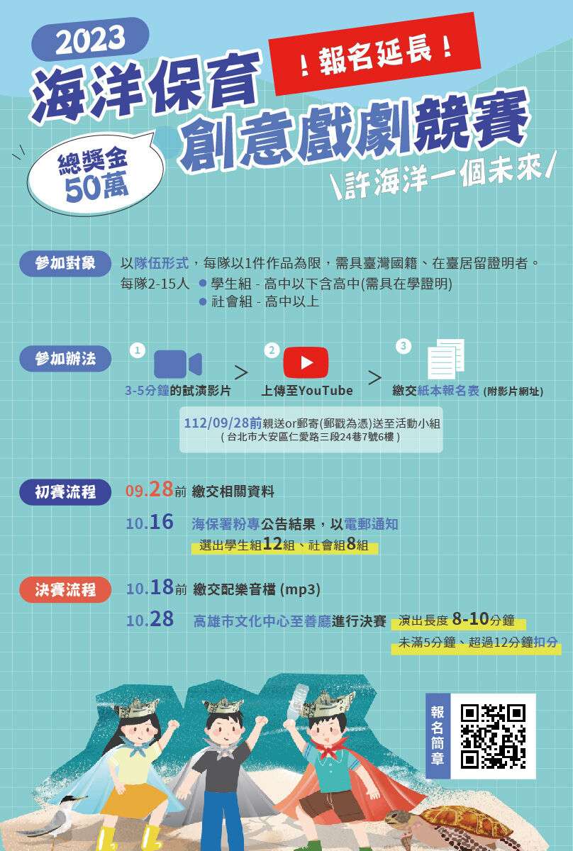 一、為擴大推廣海洋保育教育,該署112年度舉辦旨揭競賽活 動,並邀請教育部、文化部及農業部擔任指導單位,期望透過不同領域國人共襄盛舉,發揮創意思維,以多元形式 演繹如何「許海洋一個未來」,歡迎組隊報名參加競賽。