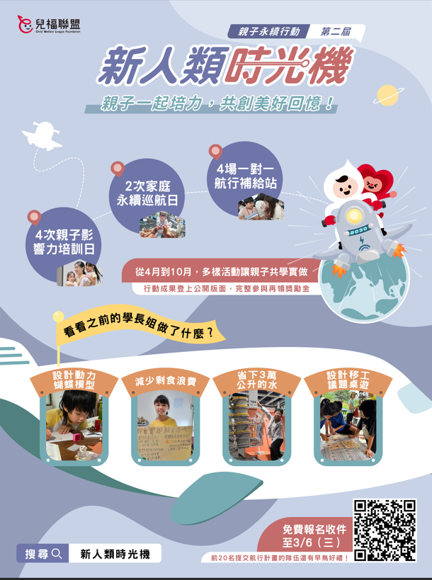 《新人類時光機》是以家庭為單位的永續行動培力計畫, 希望透過親子共學培養孩子的觀察、同理能力,並讓 親子在過程中一同練習關懷世界,接觸更多元的永續發展 (Sustainable Development)議題,建立孩子的國際視野 並培養孩子的素養與問題解決能力,預計本屆將選出10至 15組隊伍,透過專業師資帶領的設計思考共學工作坊、多 元的戶外參訪體驗活動、一對一的永續行動方案指導會議 等等,激發孩子系統思考、解決問題以及規劃執行的能 力,發想創新永續行動方案,來解決觀察到的問題困境。 參與本次計畫不需要繳交任何費用,但須確保能參與所有計畫的課程內容,計畫期間僅能請假1次,自1月2日(二) 起開放線上填寫報名表申請,截止日期為3月6日(三), 報名申請網站: https://bit.ly/48o7eFe