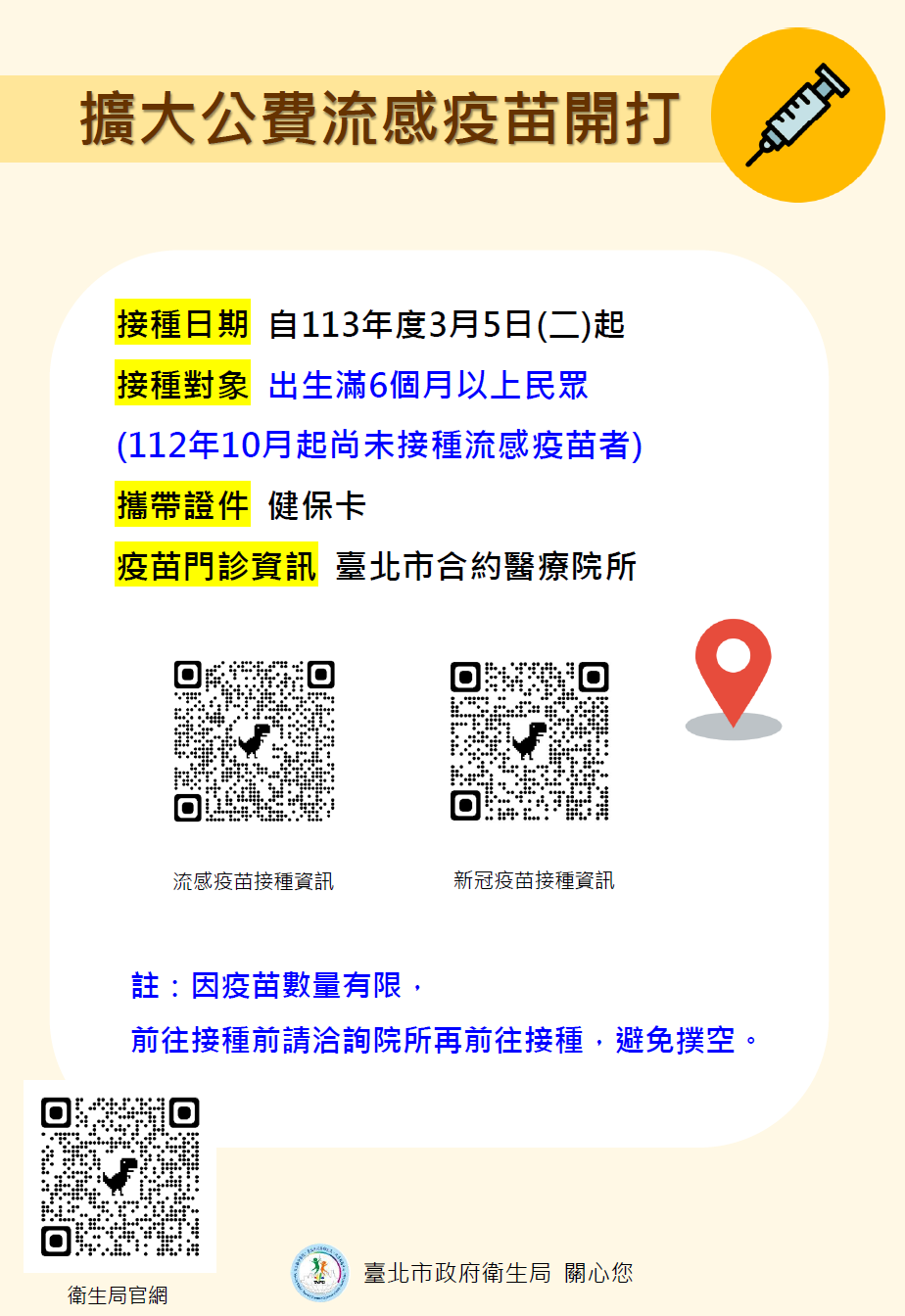 衛生福利部自113年3月5日起擴大公費流感對象為「全國出生滿6個月以上尚未接種之民眾」,112年10月以後尚未接種流感疫苗者,可洽本市166家合約醫療院所(含31家醫院及135家診所)接種;另因疫苗數量有限,於接種前請先洽詢醫療院所再前往接種,避免向隅。