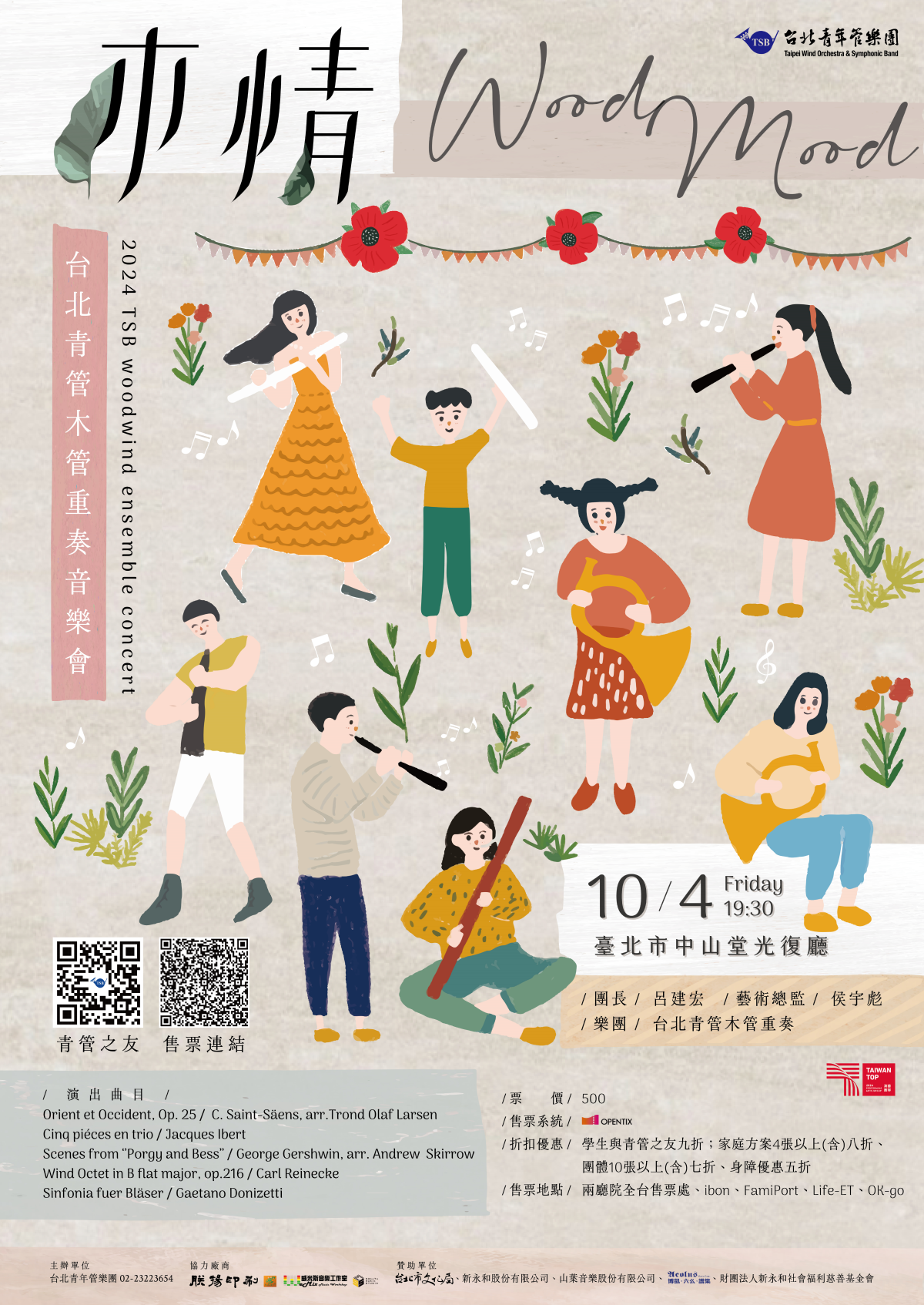 一、2024台北青管木管重奏音樂會,由國內音樂名家與台北青 管老師團團員組成;帶來多首經典木管重奏之樂曲,曲目 多元豐富,音樂悅耳動聽,是您不可錯過的音樂饗宴。