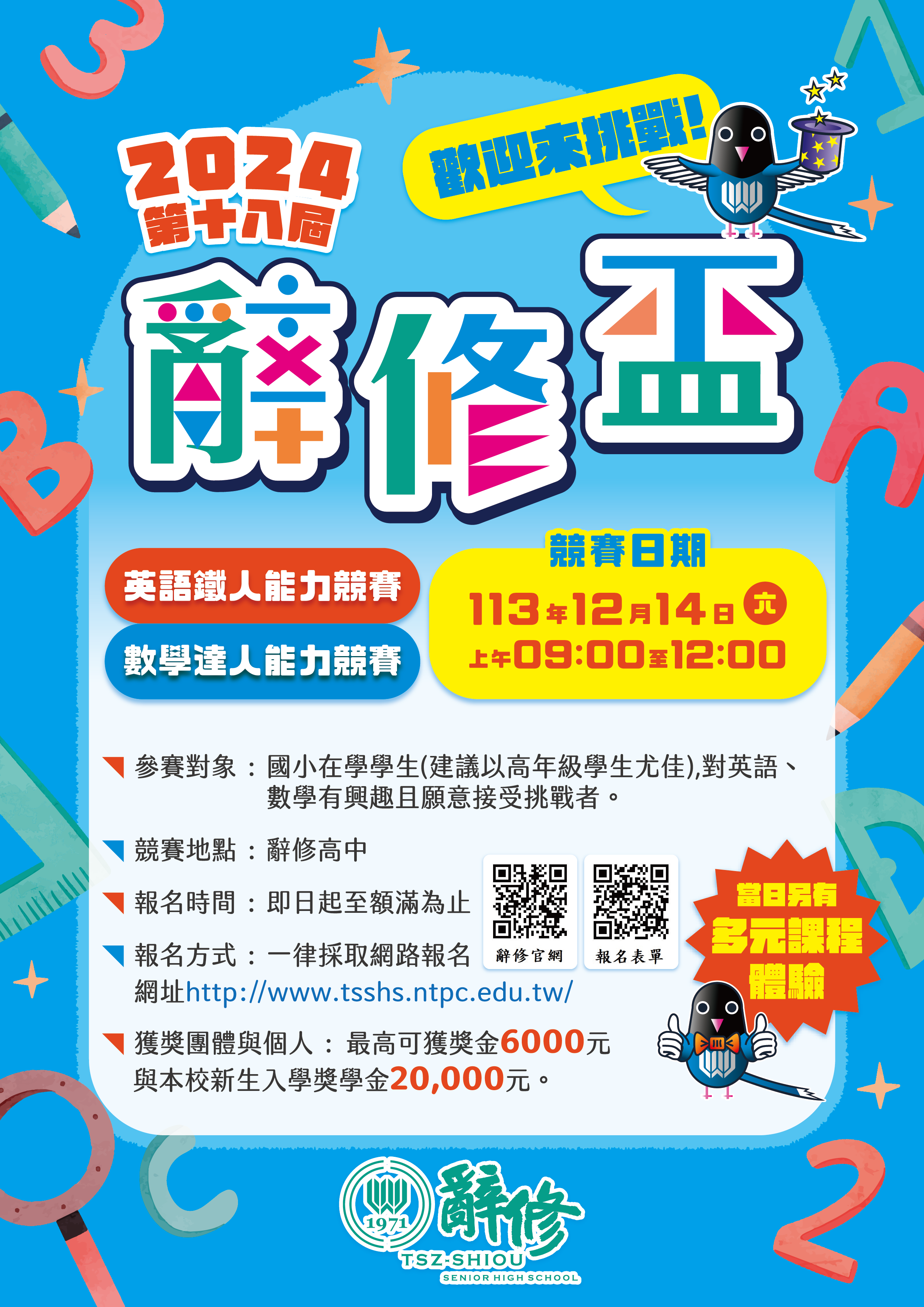 四、競賽辦法詳如附件(可於本校官網/辭修盃報名專區下 載);如有任何關於比賽的問題,請洽本校設備組查詢,聯絡電話:02-86761277#210。