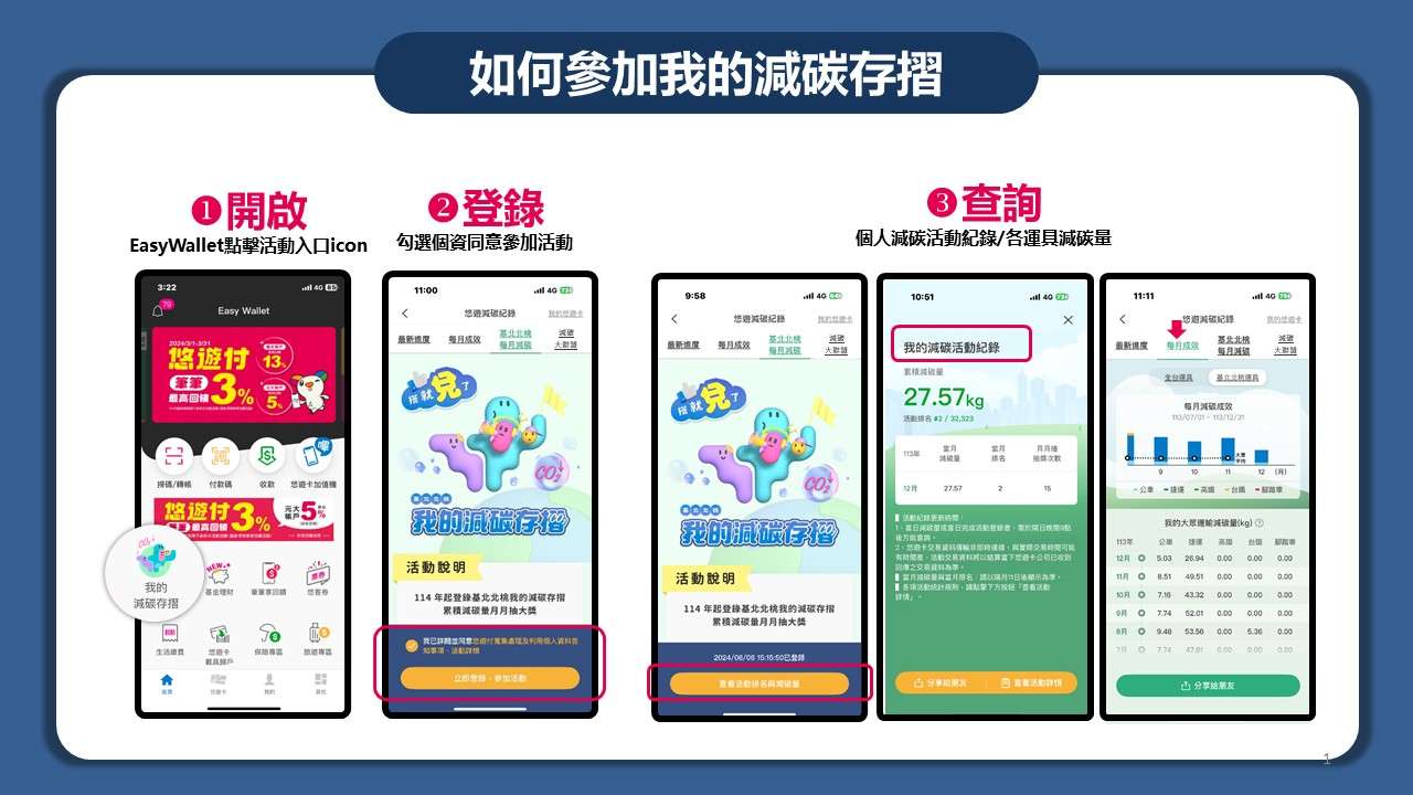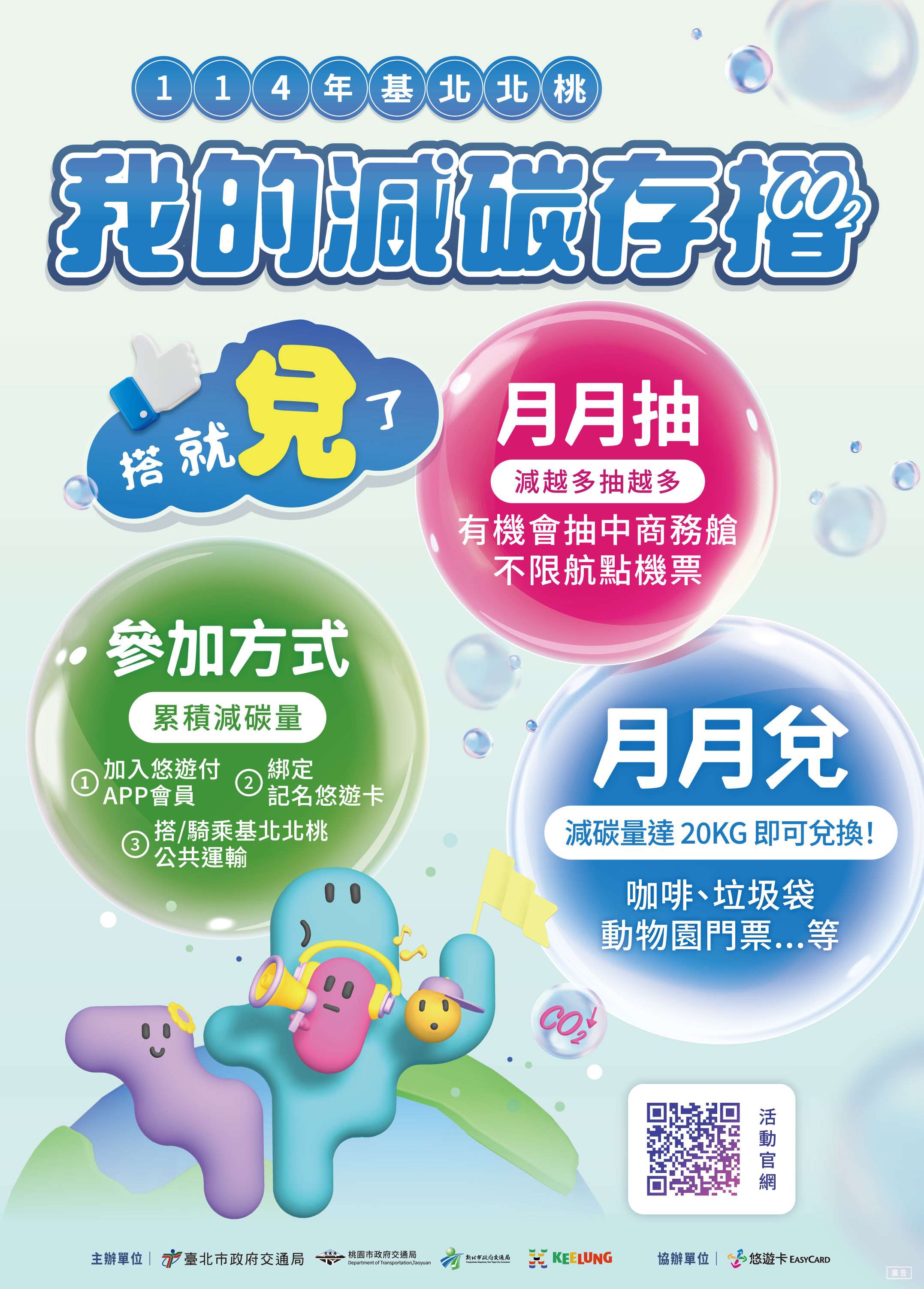 為攜手市民多加使用公共運輸,以朝淨零碳排目標前進,由基北北桃四市交通單位、公共運輸業者及悠遊卡股份有限公司共同推動的「減碳存摺」活動,114年度擴大辦理並增加兌獎制活動,民眾累積達一定減碳量即可登錄兌換獎項,提高民眾參與誘因,活動辦理期間自114年1月1日至12月31日止,詳細內容可至本活動官網查閱114年活動資訊(https://co2-passbook.com/)。