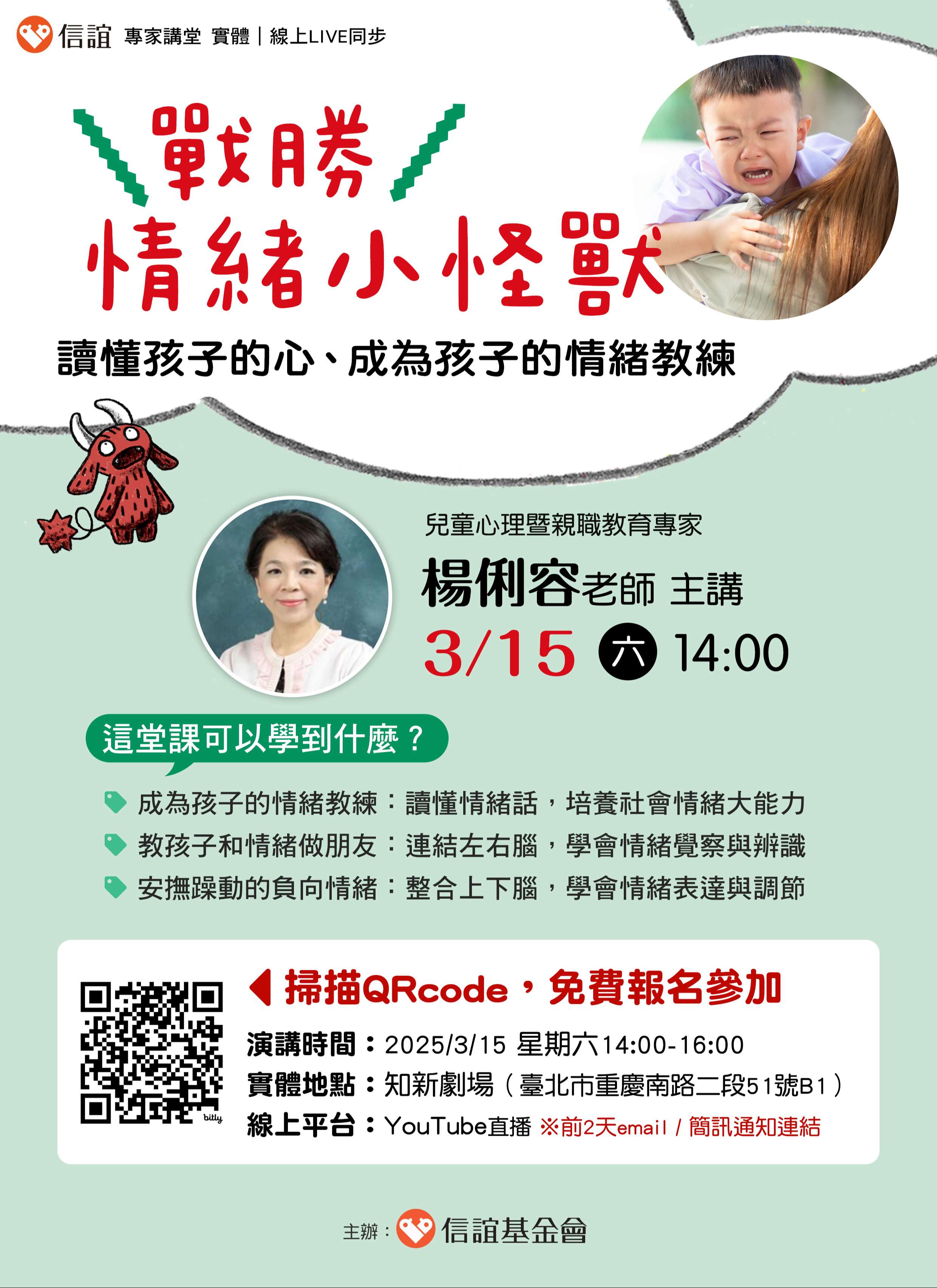 一、動不動就哭、說翻臉就翻臉、一言不合就打人…你以為的 「壞脾氣」可能隱藏更多情緒?外在行為與反應是孩子表 達感受最直接的方法,也是練習面對與應對情緒的絕佳機 會。信誼專家講堂將於2025年3月15日(六)下午2:00- 4:00舉辦【戰勝情緒小怪獸!讀懂孩子的心、成為孩子的 情緒教練】實體/線上LIVE 講座,邀請爸媽免費報名參 加。