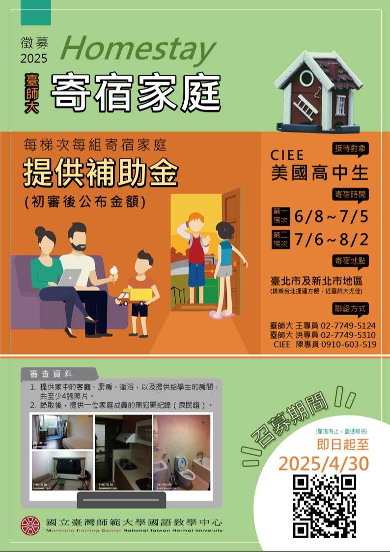 一、目的: 為促進美國高中生於臺學習期間與當地臺灣人進行 文化交流、培養日常生活中運用華語的能力,故特別招募 台灣寄宿家庭,提供高中生四週上課期間的寄宿接待。本 次辦理招募相關說明會,並分享接待家庭之相關經驗,敬 邀各校校長、主任、師長、國際教育承辦人及有興趣之家 長參加。