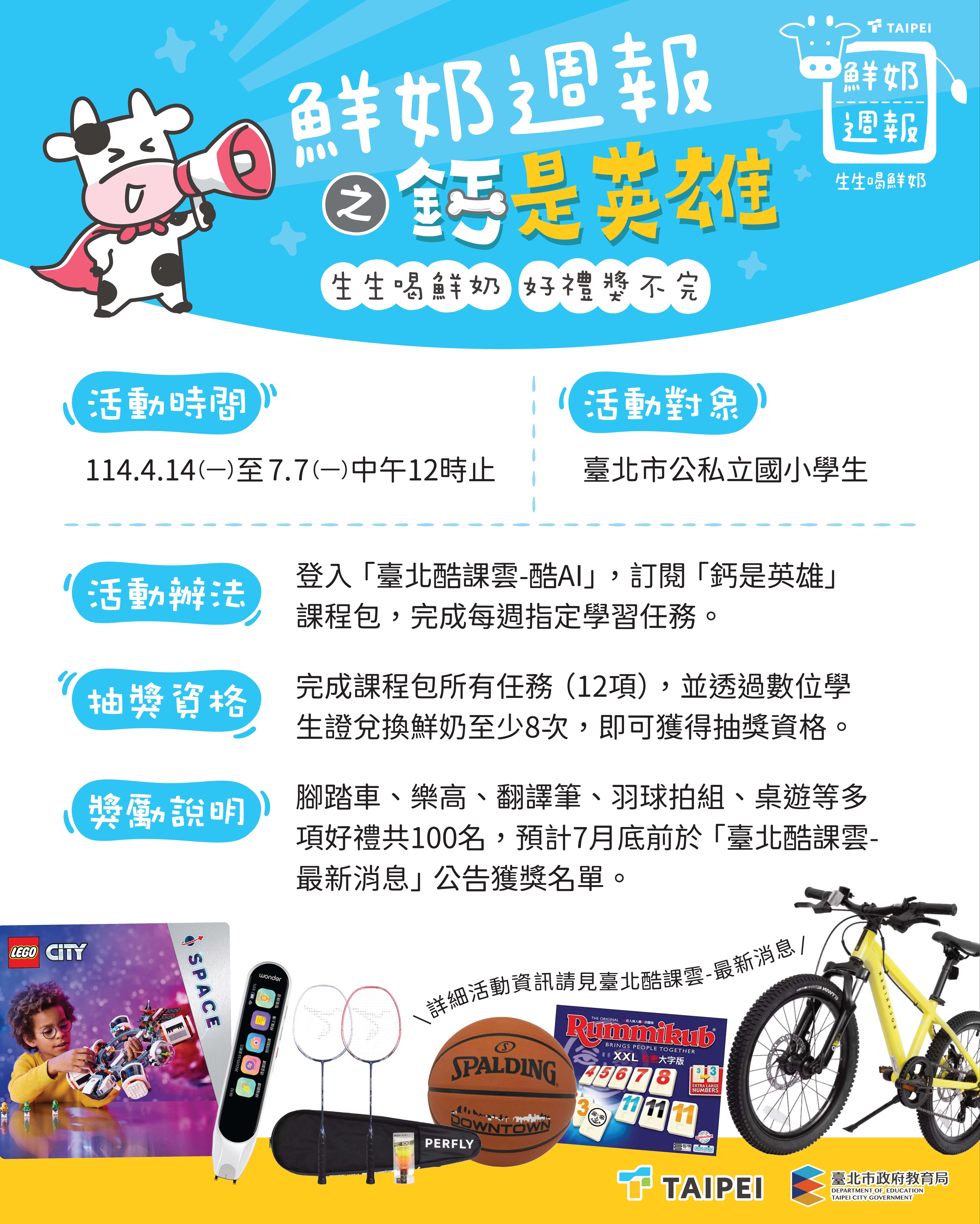 (三)任務說明:活動期間,每週一將更新一項課程包學習任務,學生累積完成完成12項任務,並有透過數位學生證兌換補助乳品(鮮奶或豆漿)至少8次,即可獲得抽獎資格。