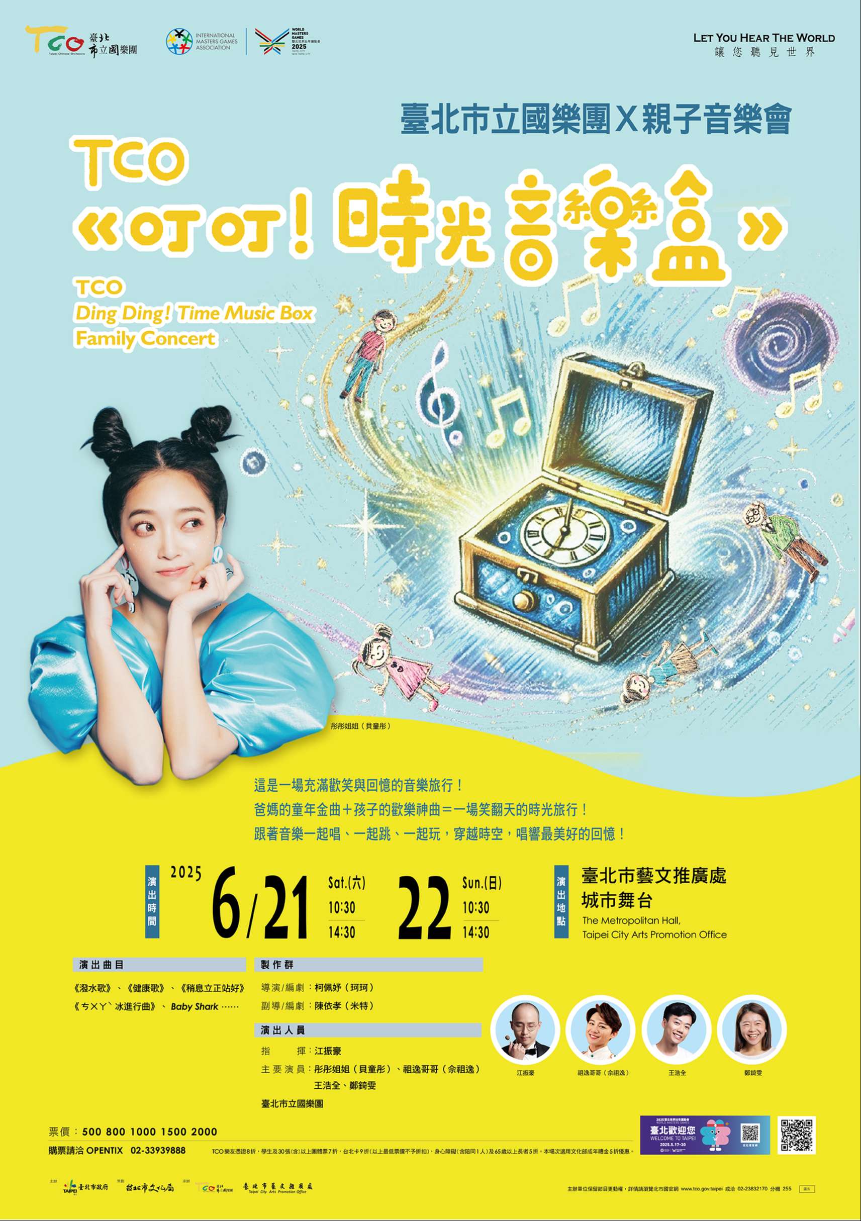 一、臺北市立國樂團將於114年6月21日、22 日假臺北市藝文推廣處城市舞台演出《叮叮!時光音樂 盒》親子音樂會。特別邀請彤彤姐姐、祖逸哥哥等小朋友 喜愛的哥哥姐姐們與國樂團演出,有爸媽熟悉的童年金曲 和孩子最愛的快樂神曲,交織出一場跨世代的歡樂派對。