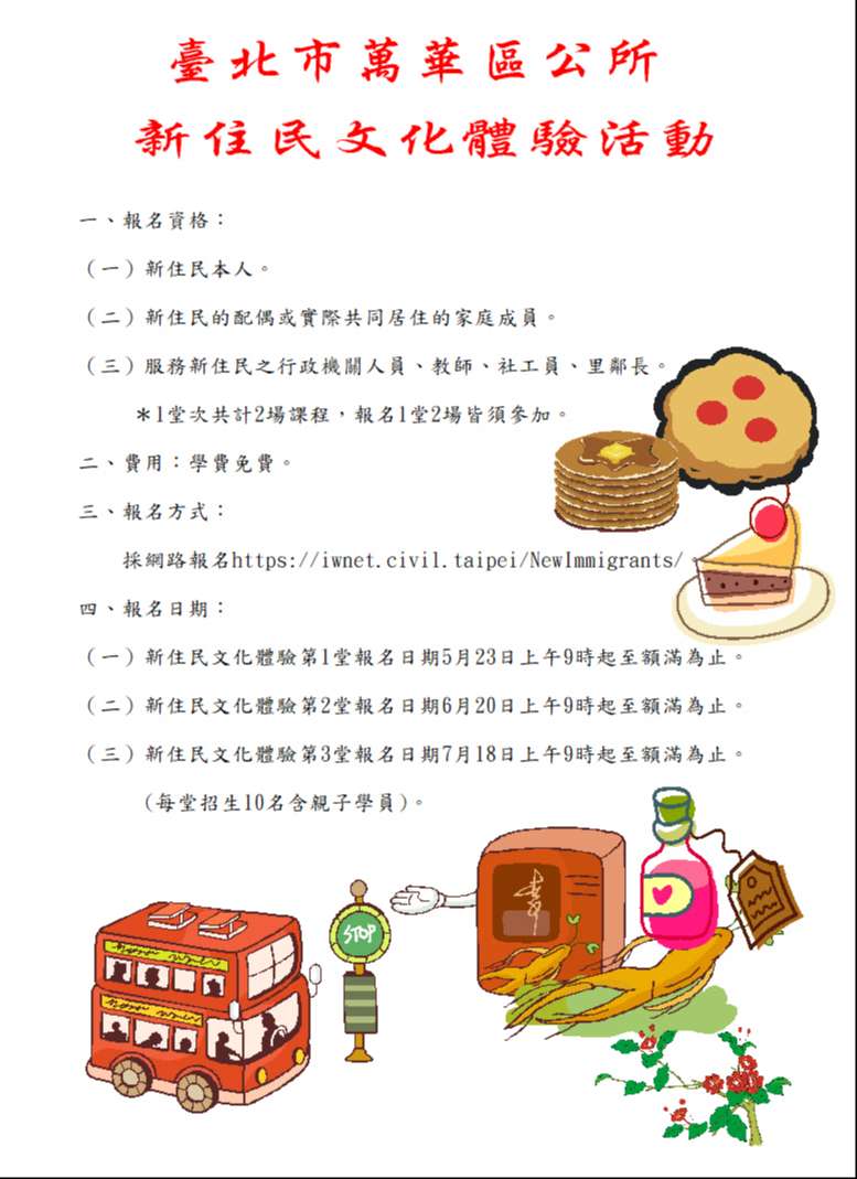 臺北市萬華區公所將於114年6月1日、6 月28日、7月26日3場次,假臺北市臺北市萬華區辦理文化 體驗活動歡迎報名參加,報名網址: https://iwnet. civil.taipei/NewImmigrants/。詳情請參閱萬華區公所網 站或電洽(02)2306-4468轉204陸先生