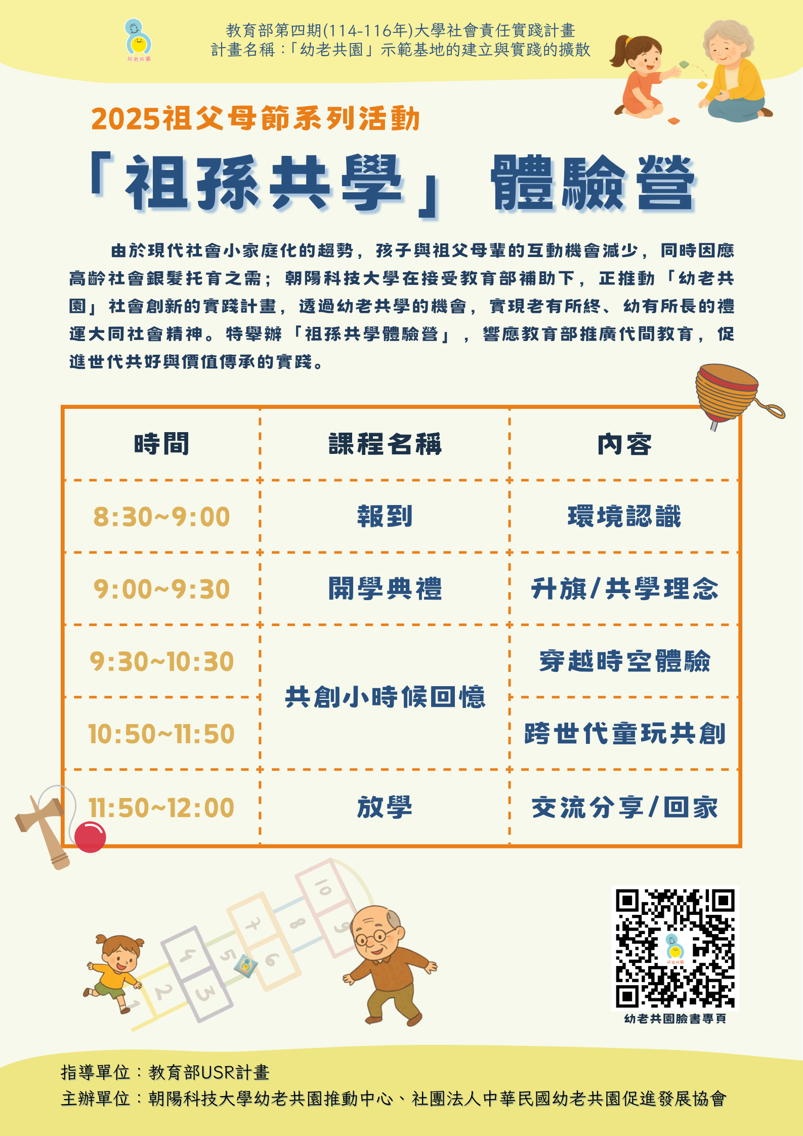 主旨:函轉朝陽科技大學辦理「教育部大學社會責任(USR)實 踐計畫」,訂於祖父母節前夕及暑假期間舉辦「祖孫共學 體驗營」,請查照。