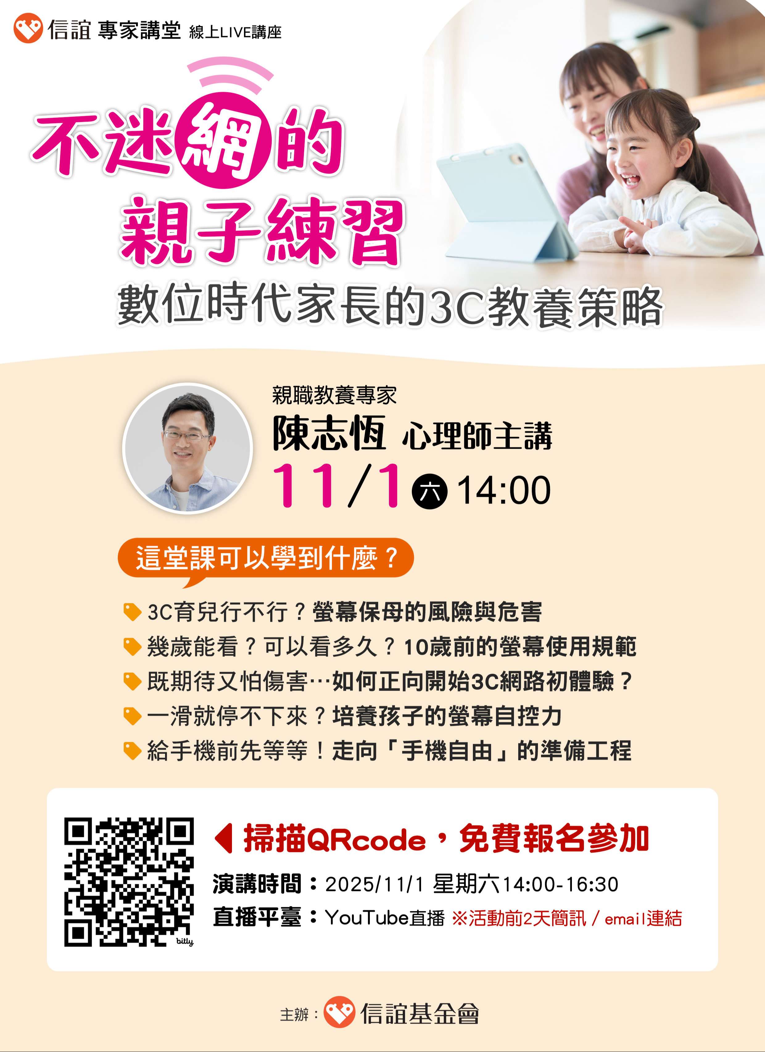 一、面對數位裝置普及、AI浪潮來襲,教養挑戰正不斷升級。唯有從「家」出發,啟動正向3C教養策略,才能讓數位工具成為孩子成長的助力,而非阻力。信誼將於2025年11月1日(六)下午2:00-4:30舉辦【不迷「網」的親子練習:數位時代家長的3C教養策略】線上LIVE講座,邀請家長免費報名參加。