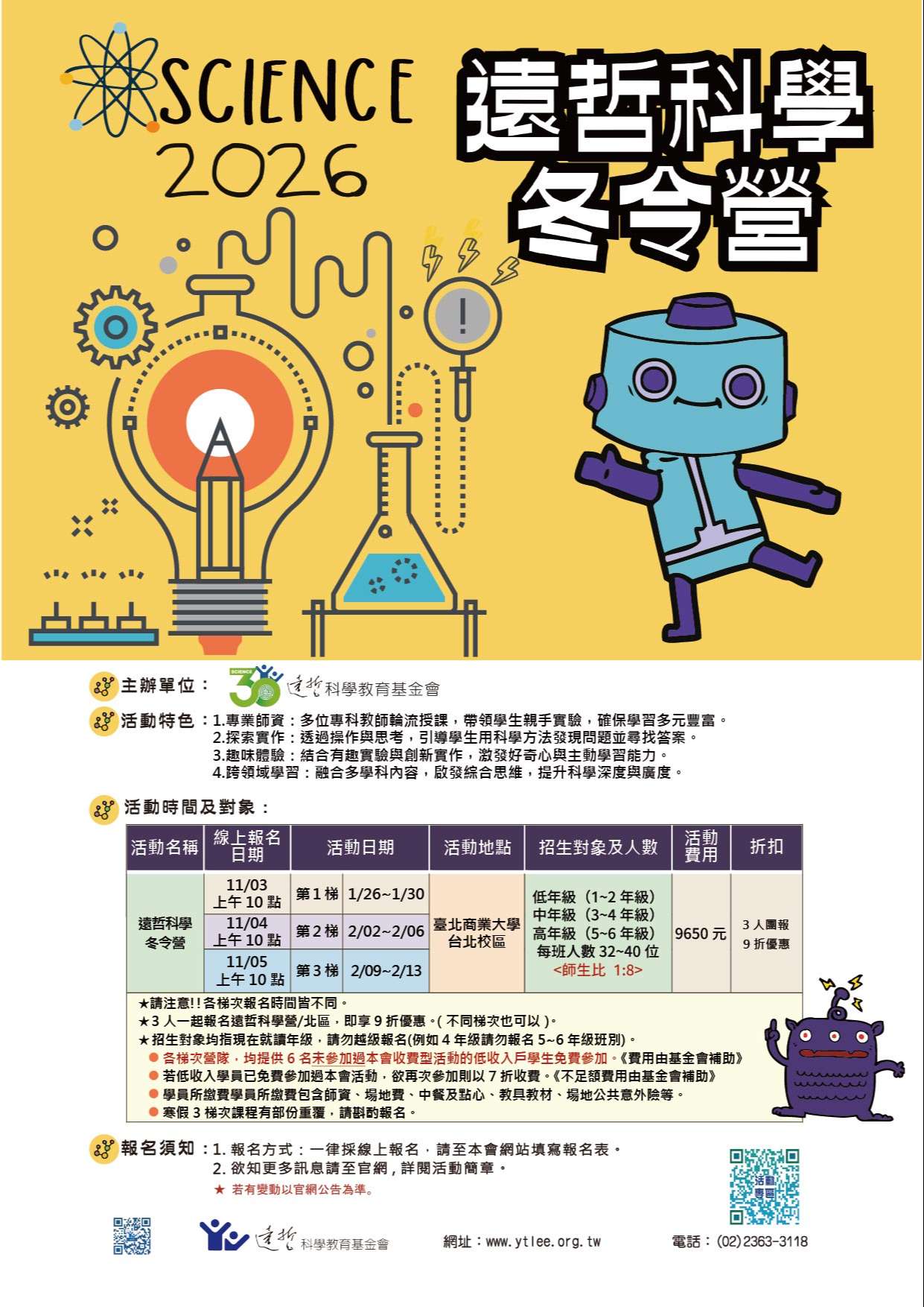 財團法人遠哲科學教育基金會將舉辦「2026 遠哲科學冬令營」,歡迎有興趣的學生踴躍報名參加。