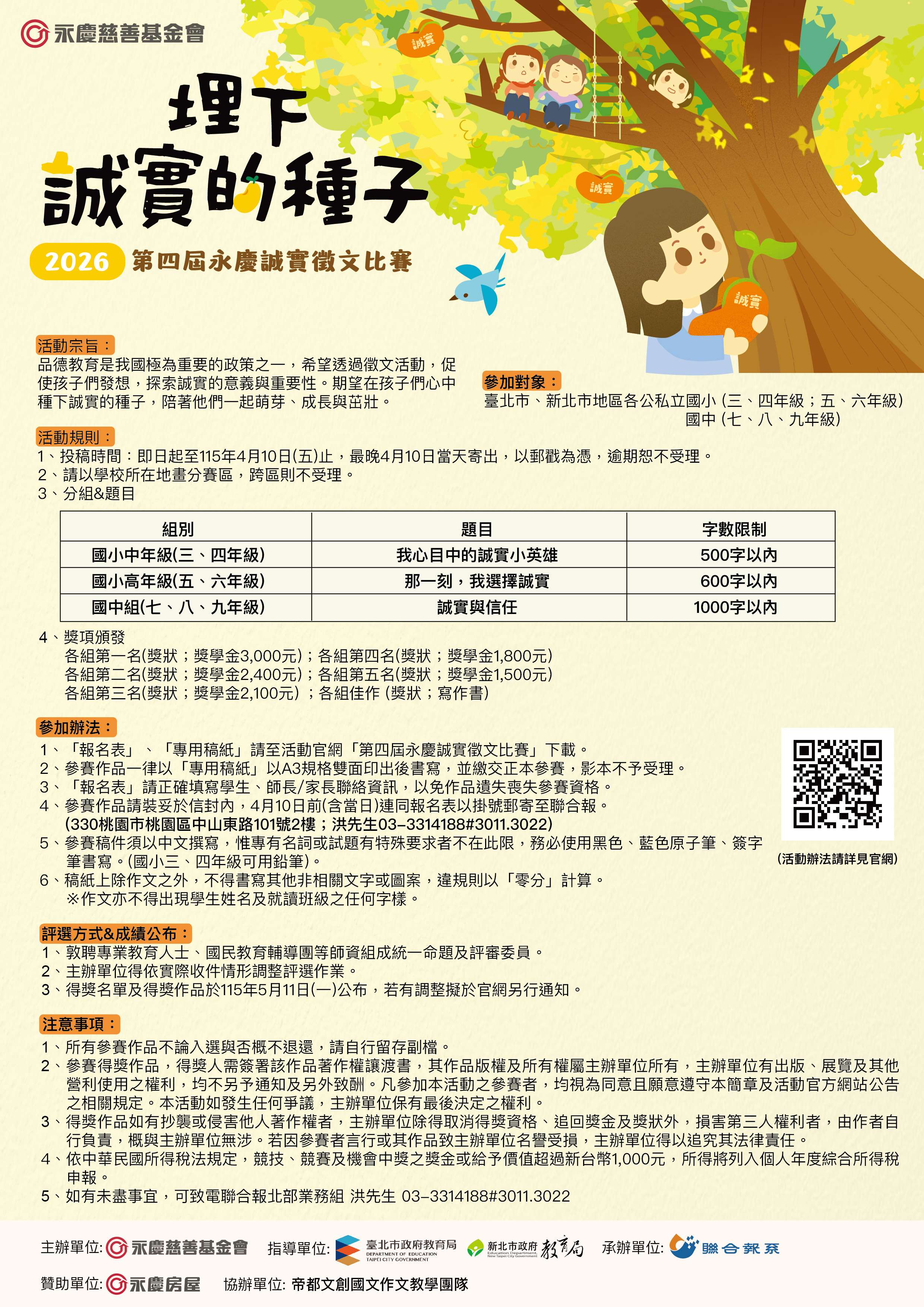四、檢附「第四屆永慶誠實徵文活動」實施計畫、活動簡章、宣傳海報、報名表及專用稿紙各1份,請自行下載參閱。