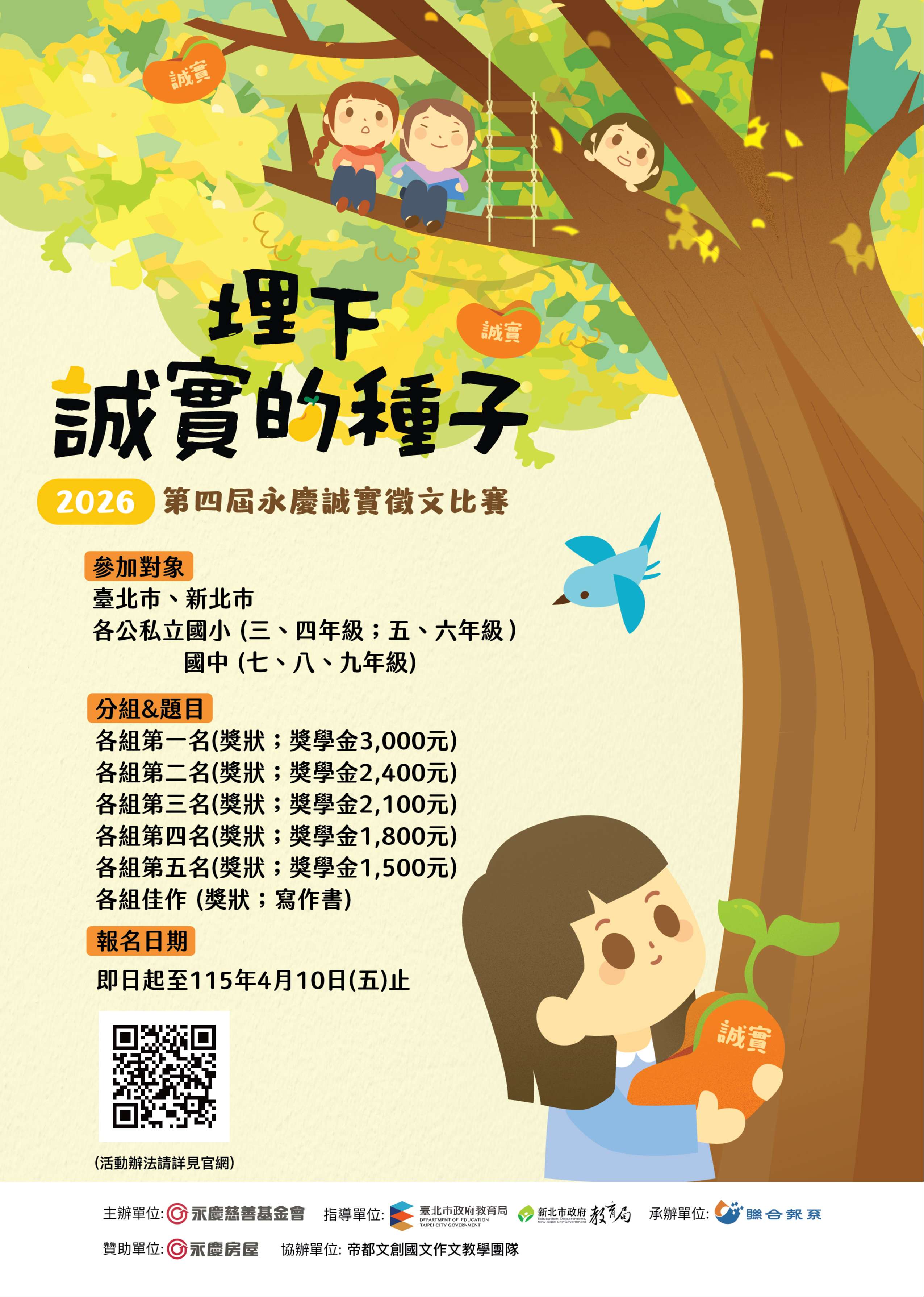 二、本活動以「埋下誠實的種子」為主題,透過徵文方式培養學生對生活的觀察力,並在寫作過程中探索自我價值與思考方向,期能將品格教育理念向下扎根,並落實於日常生活之中。