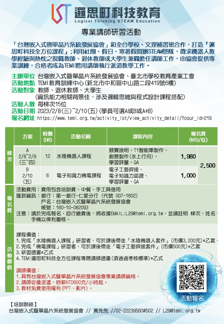 一、台灣嵌入式暨單晶片系統發展協會與本會主辦,於112年2 月8-10日辦理【邏思町科技教育】專業講師研習活動, (2 月8-9日水陸機器人課程)及 (2月10日電子知識力機電課 程),敬邀貴校教師踴躍參加(研習資料詳見附件)。