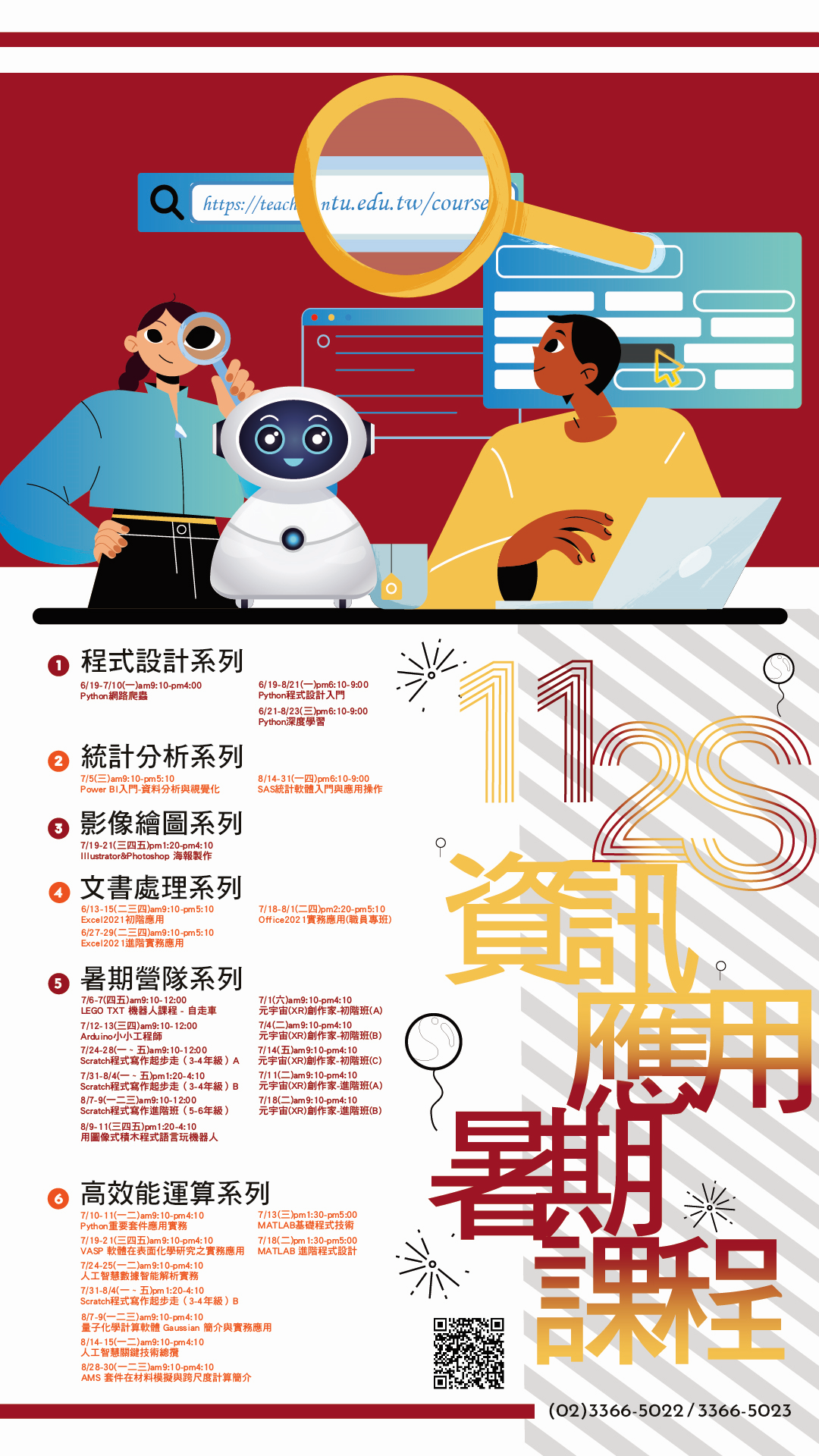 二、該中心暑假資訊應用課程共開設六大系列課程:程式設 計、統計分析、影像處理、文書處理、暑假兒童班、高效 能運算系列,活動海報與課程一覽表如附件。