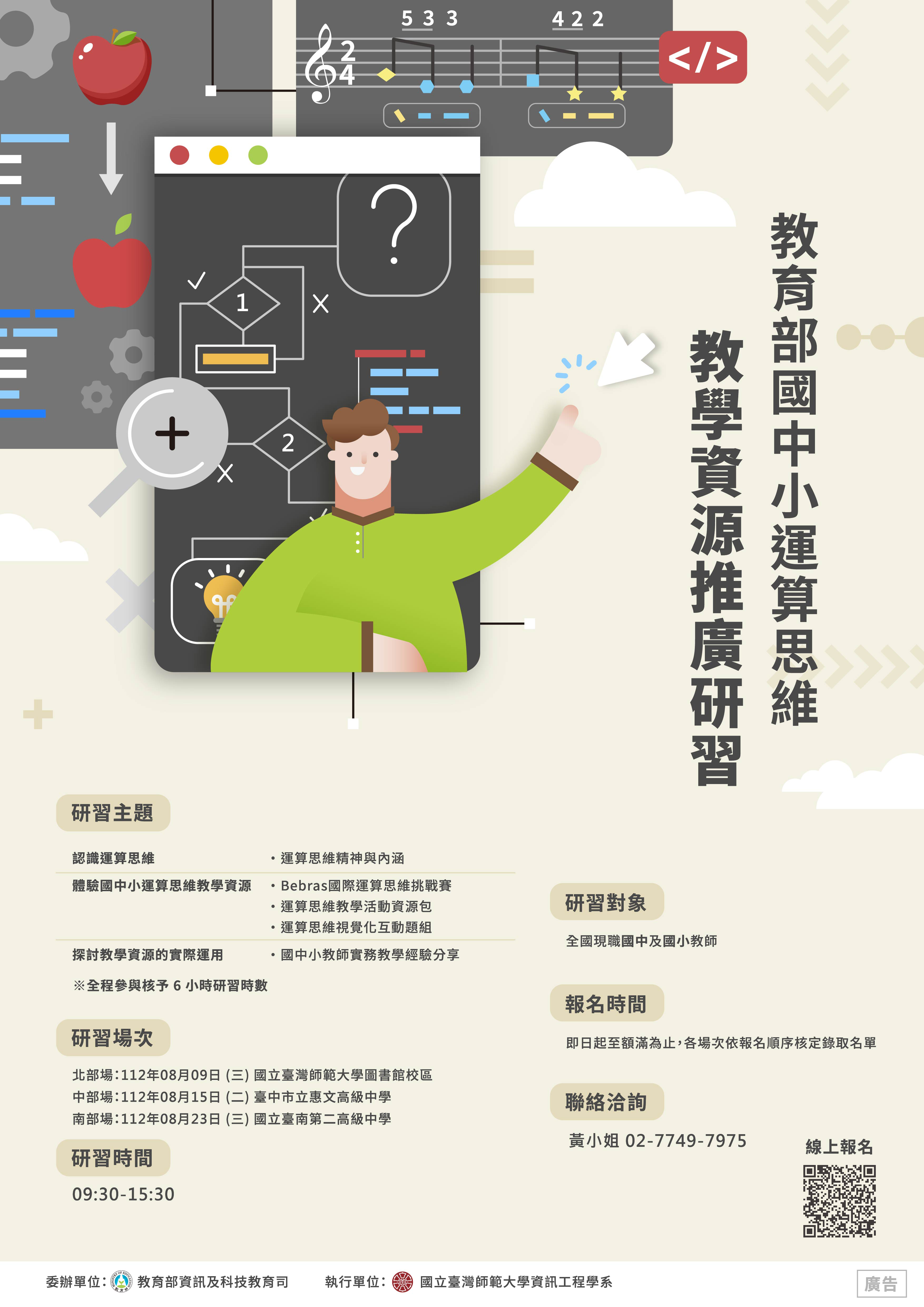 二、為推廣國中小運算思維教學資源與運用策略,協助教師活 用以幫助學生建立良好的運算思維及未來進行程式學習基 礎,該校特辦理旨揭研習,相關資訊摘錄如下: