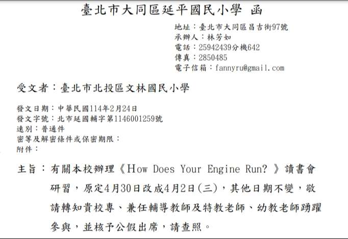 主旨:有關本校辦理《How Does Your Engine Run? 》讀書會 研習,日期調整通知,敬請轉知貴校專、兼任輔導教師及 特教老師、幼教老師踴躍參與,並核予公假出席,請查 照。