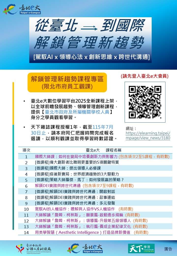 一、為持續引領本府同仁掌握國際趨勢及前瞻觀點新知,臺北e 大數位學習平臺2025全新課程上架,以全球前瞻發展趨 勢、領導管理創新課程,提供「臺北市政府及所屬機關學 校人員」身分之學員觀看學習。 二、旨揭數位課程由天下雜誌授權1年,截至115年7月30日止, 敬請轉知所屬人員踴躍至臺北e大數位學習網選讀學習。課程請上:「解鎖管理新趨勢課程專區」 https://elearning.taipei/mpage/view_news/3180。(請 先登入臺北e大會員,課程清單如附件)