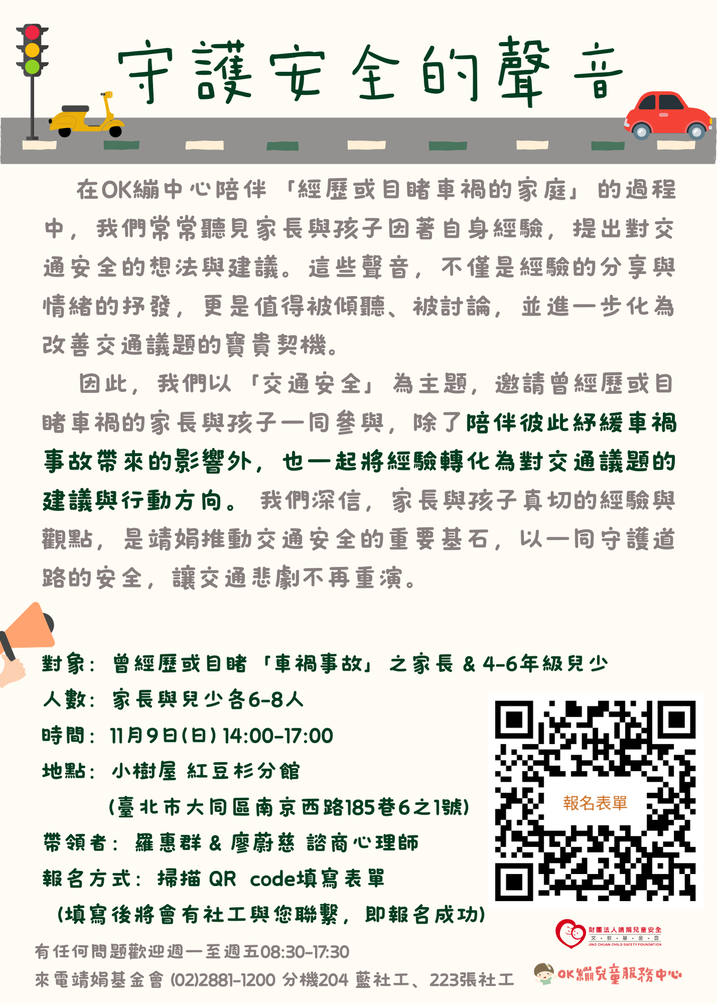 二、靖娟基金會OK繃兒童服務中心將於114年11月9日14時至17 時辦理以「交通安全」為主題之團體活動,邀請曾經歷或 目睹車禍之家長及兒少共同參與,期協助家長及兒少紓緩 事故影響之餘,也能凝聚意見並討論交通環境的改善方 向。